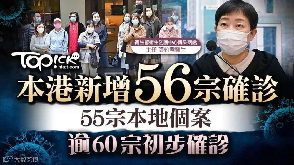 香港特区政府卫生署卫生防护中心19日下午介绍,截至19日0时,香港新增56例新冠肺炎确诊病例,包括本地感染病例55例、其中23例感染源不明,输入性病例有1例。香港累计报告新冠肺炎确诊病例9720例。
