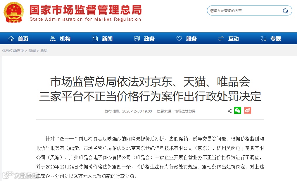 12月30日晚,市场监管总局公告称,针对“双十一”前后消费者反映强烈的网购先提价后打折、虚假促销、诱导交易等问题,根据价格监测和投诉举报等有关线索,市场监管总局依法对北京京东世纪信息技术有限公司(京东)、杭州昊超电子商务有限公司(天猫)、广州唯品会电子商务有限公司(唯品会)三家企业开展自营业务不正当价格行为进行了调查,并于2020年12月24日依据《价格法》第四十条、《价格违法行为行政处罚规定》第七条作出处罚决定,对上述三家企业分别处以50万元人民币罚款的行政处罚。