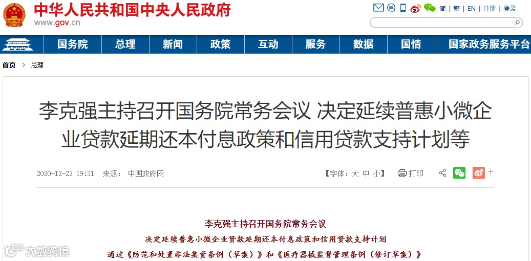 据中国政府网消息,国务院总理李克强12月21日主持召开国务院常务会议,决定延续普惠小微企业贷款延期还本付息政策和信用贷款支持计划,通过《防范和处置非法集资条例(草案)》和《医疗器械监督管理条例(修订草案)》。
