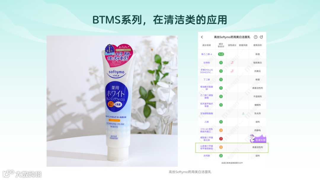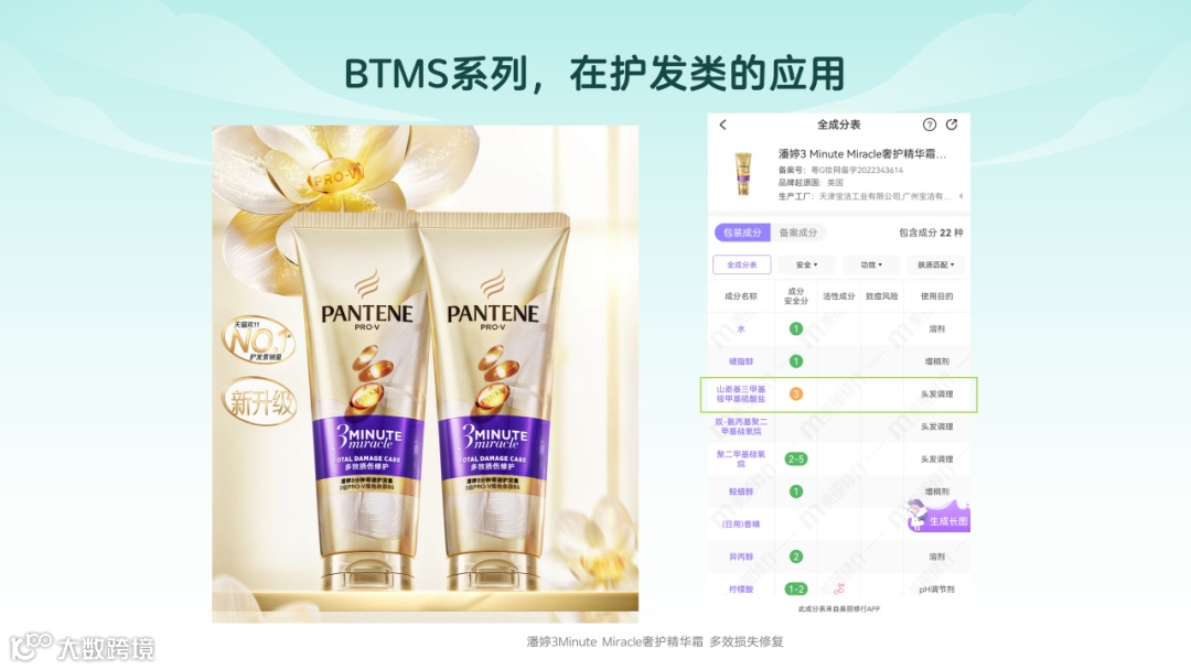 衍生自非转基因的菜籽油中提炼的山嵛酸,经过复杂的科学工艺合成。因其山嵛基结构部分具有独特的直接吸附和抗静电性能,它在个人护理品中有广泛的用途。它的功能包括了润湿、清洁、调理、柔软、悬浮和乳化。BTMS对头发具有卓越的抗缠结能力,并且不会累积在头发上。它是目前为止最温和的抗头发缠结的原料之一。