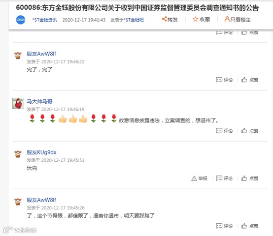 这不是*ST金钰第一次因财务造假被通报,早在今年9月16日,*ST金钰因虚构销售交易和采购交易,被证监会下发《行政处罚决定书》及《市场禁入决定书》。证监会决定对东方金钰责令改正,给予警告并处以60万元的罚款;对其他责任人处以警告以及3万至30万不等的罚款。多名造假当事人被处以市场禁入等措施。