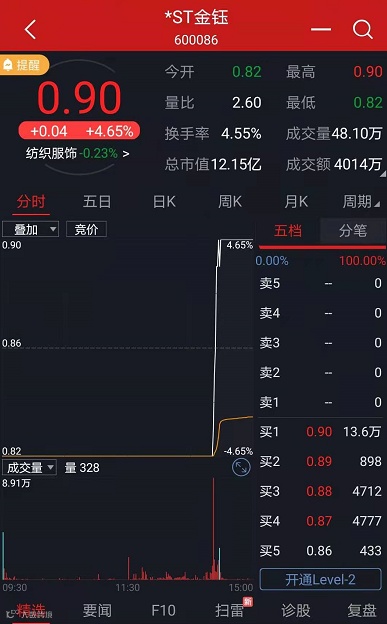 今年7月7日,*ST金钰收盘价首次跌破1元面值,但在几天后又迅速回到1元以上。