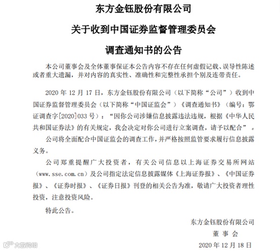 公告称,2020 年 12 月 17 日,公司收到中国证监会《调查通知书》(编号:鄂证调查字[2020]033 号),因公司涉嫌信息披露违法违规,根据《中华人民共和国证券法》的有关规定,证监会决定对公司进行立案调查。