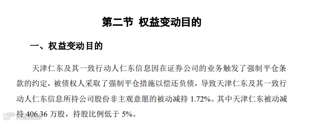 21日晚间,仁东控股披露了简式权益变动报告书,仁东(天津)科技有限公司(天津仁东)及其一致行动人北京仁东信息技术有限公司(仁东信息)在证券公司的业务触发了强制平仓条款的约定,被债权人采取了强制平仓措施以偿还负债,导致天津仁东及仁东信息所持公司股份非主观意愿的被动减持1.72%。其中天津仁东被动减持406.36万股,持股比例低于5%。