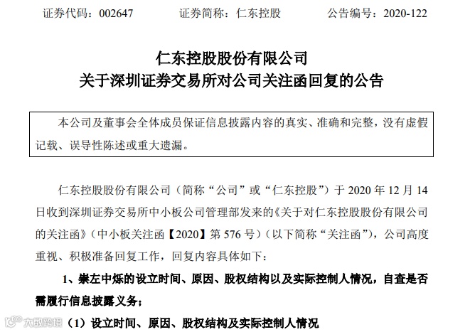12月14日,仁东控股曾收到深圳证券交易所中小板公司管理部《关于对仁东控股股份有限公司的关注函》,仁东控股21日晚间披露了回复内容。根据公司自查情况及相关法律法规的规定,崇左中烁作为上市公司员工(含董事、高管)设立的合伙企业来持有上市公司股份,合法合规、无需披露。经自查崇左中烁自成立以来的买卖仁东控股的具体情况,不存在短线交易、内幕交易、在定期报告披露窗口期买卖股票等违法违规行为。