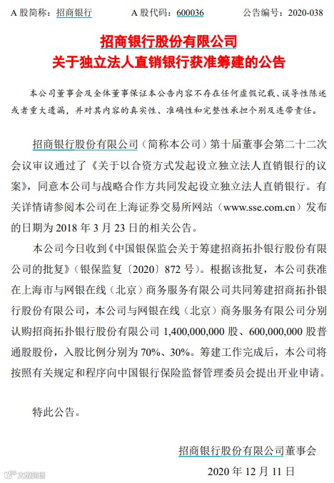 据银保监会批复,招行最终获批筹建的独立法人直销银行名为“招商拓扑银行”,非此前媒体报道的“招东银行”。
