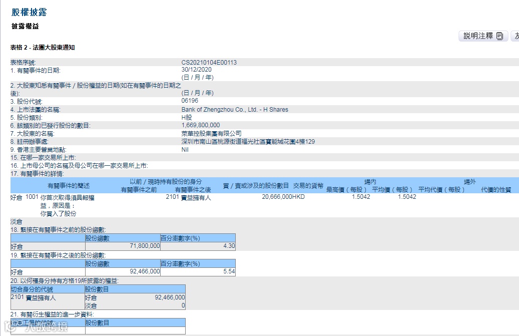 港交所的股权变更披露公告显示,莱华控股集团有限公司(简称“莱华控股”)以1.5042港元的每股平均价格,在近日买入郑州银行H股2066.6万股。