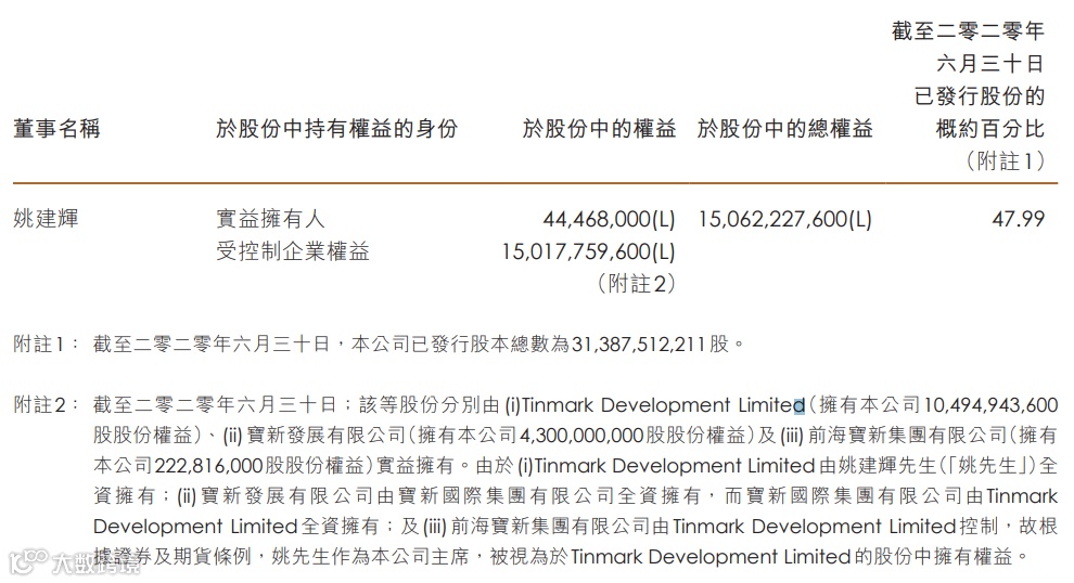 业内熟知的是,曾经的中国金洋(现已更名为“宝新金融集团有限公司”)是姚建辉的资本运作平台。宝新金融2020年半年显示,姚建辉为该公司的实际控制人,通过个人及其控制的实体Tinmark Development Limited合计持有47.99%的股权;此外,宝能系旗下的前海人寿也现身宝新金融的主要股东,持有宝新金融42.2亿股好仓,占已发行股份的13.44%。