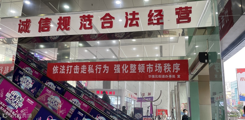 记者在曼哈、万美、远望、明通商城内发现,这些商场内到处贴有“打击走私,利国利民,全民参与,禁绝走私”、“依法打击走私行为,强化整顿市场秩序”、“诚实守法经营 合法合规宣传”、“打击假冒伪劣化妆品 维护公平有序市场”、“诚信兴商 守法共赢”等红色横幅,部分右下角标注为“华强北街道办事处”宣。