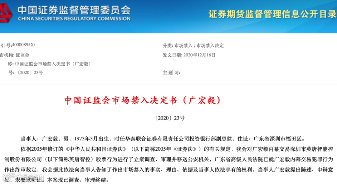 1月8日,证监会网站更新一则市场禁入决定,原华泰联合证券投行部副总监广宏毅(2004年5月成为全国首批保代),因内幕交易英唐智控,合计成交金额达3830.59万元,最终被广东省高院认定构成内幕交易罪,依法判处其有期徒刑三年,缓刑五年,罚金人民币12万元。