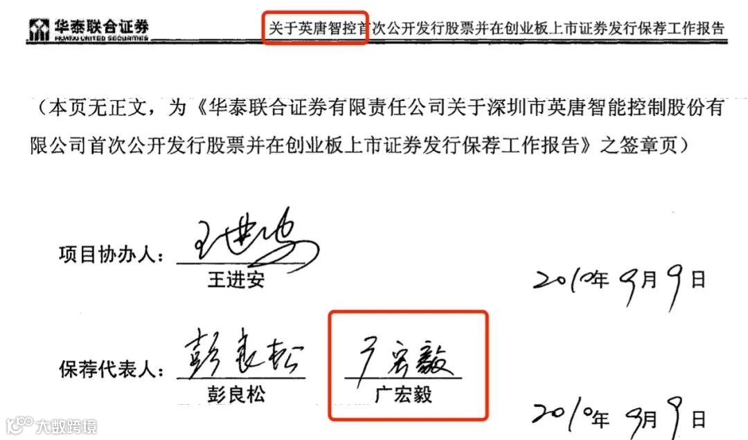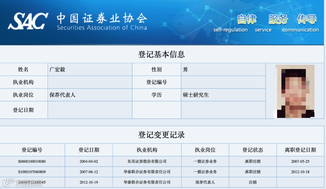公开信息显示,广宏毅出生于1973年3月,现年48岁。2004年5月,年仅31岁的广宏毅获得全国首批保荐代表人资格,成为当时东吴证券仅有的6名保代之一,前途一片大好。不久又于2007年6月加盟华泰联合证券,担任该公司投行部副总监,此人已于2014年离开华泰联合。