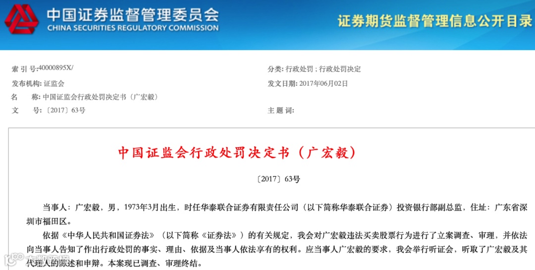 刚被证监会申请强制执行581万罚没资金,又因内幕交易遭终身市场禁入,现年48岁的广宏毅最终没能逃过恢恢法网。