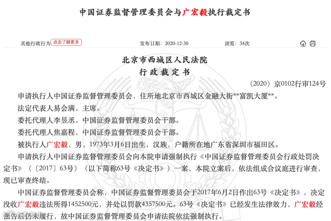 然而近两年时间过去,拿到终审判决结果的广宏毅,却始终未缴纳数百万元的罚没款项。为此证监会向北京西城区法院申请强制执行相关行政处罚决定。根据中国裁判文书网2020年12月30日公布的行政裁定书,北京西城区法院已于2020年6月15日对此准予强制执行,裁定送达后即发生法律效力。