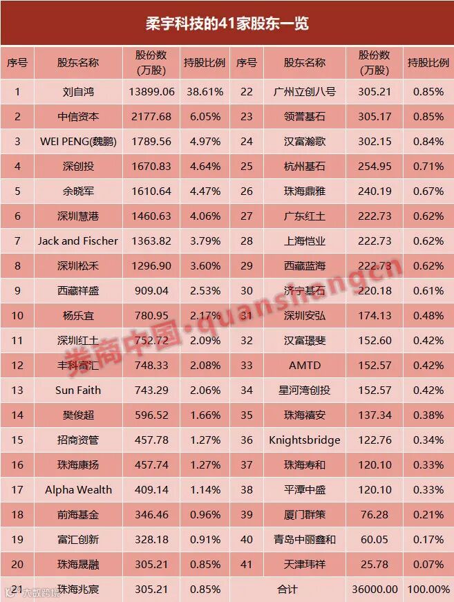 在柔宇科技目前的41家股东中,除去包括高管层在内的5位自然人刘自鸿、魏鹏、樊俊超、余晓军及杨乐宜,共有36家风投机构早早提前入驻,其中就包括中信资本、深创投、Jack and Fischer、Alpha Wealth等在内的多家国内外知名机构。