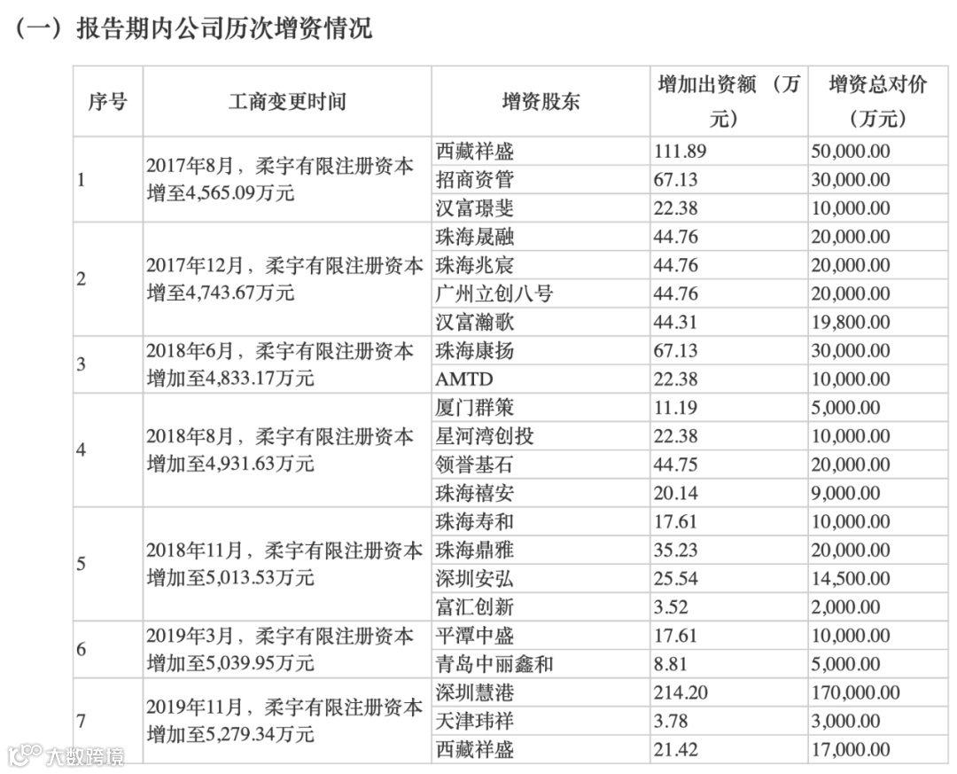 与此同时,仅在2017年8月至2019年11月的两年多时间内,柔宇科技就迅速进行了7次增资,共涉及21家股东,增资总对价50.53亿元,注册资本累计新增915.68万元。其中西藏祥盛期间还先后两次增资,合计出资6.7亿元。