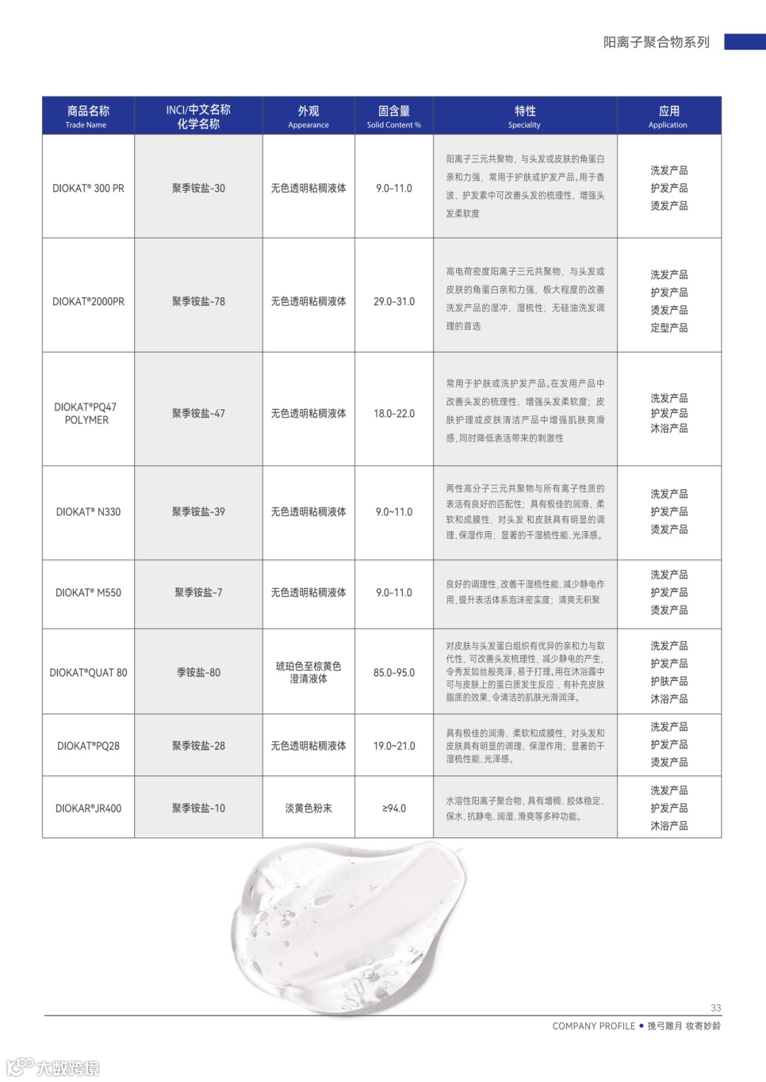 高电荷密度阳离子三元共聚物,与头发或皮肤的角蛋白亲和力强,极大程度的改善洗发产品的湿冲、湿梳性;无硅油洗发调理的首选。