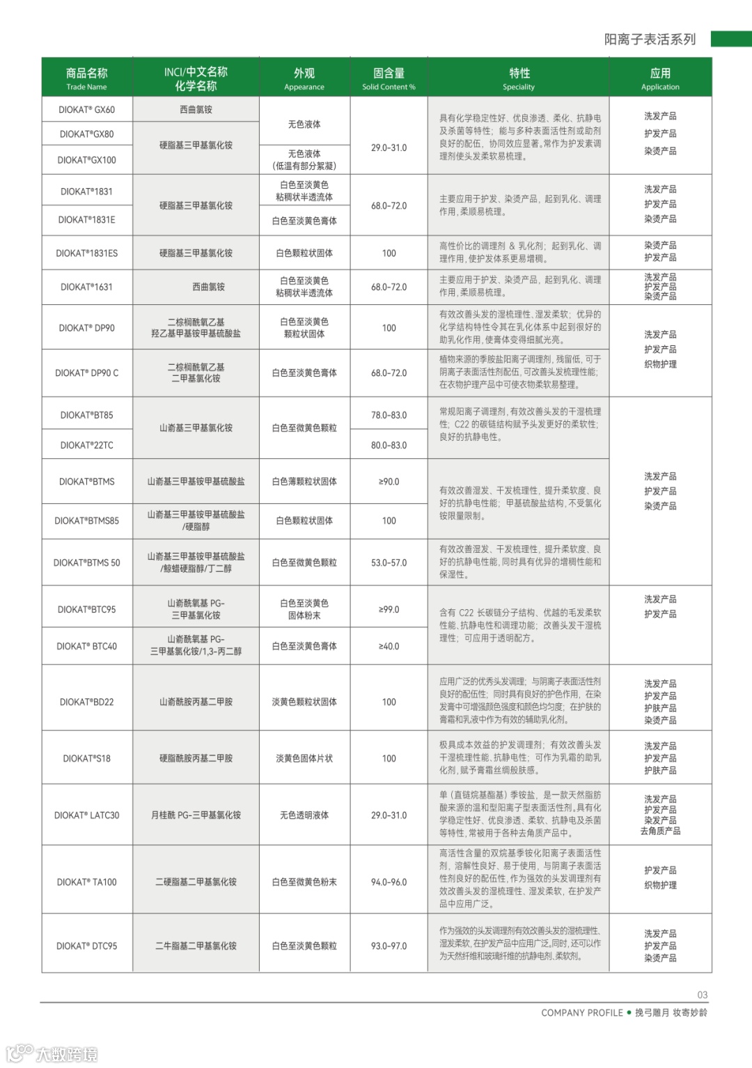 对皮肤与头发蛋白组织有优异的亲和力与取代性,可改善头发梳理性,减少静电的产生,令秀发如丝般亮泽,易于打理。用在沐浴露中可与皮肤上的蛋白质发生反应,有补充皮肤脂质的效果,令清洁的肌肤光滑润泽。