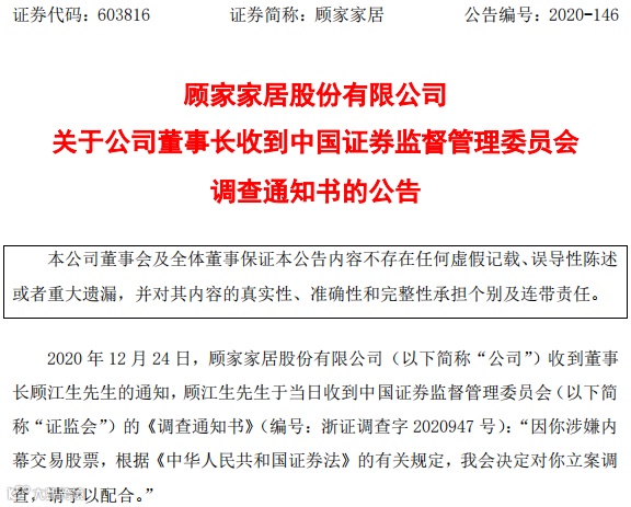 2020年12月24日,顾家家居公告称,收到董事长顾江生先生的通知,顾江生先生于当日收到中国证券监督管理委员会(以下简称“证监会”)的《调查通知书》(编号:浙证调查字2020947号):“因你涉嫌内幕交易股票,根据《中华人民共和国证券法》的有关规定,我会决定对你立案调查,请予以配合。”