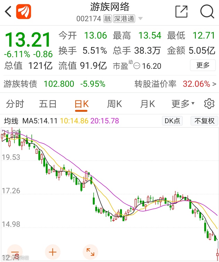 12月24日,游族网络早上开盘之后,一度暴跌超9%,收盘仍杀跌超6%。