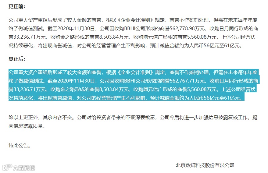 12月23日晚,数知科技发布《关于子公司经营业绩下滑暨存在商誉减值风险的提示更正公告》。公告显示,经过财务部门初步摸底及测算,数知科技4家全资子公司2020年经营业绩存在较大幅度的下滑;截至2020年11月底,以上子公司商誉余额合计61.01亿元。年报大雷阵由此拉开。24日开盘,数知科技即被按死在跌停板上,超5.6亿融资盘被埋。
