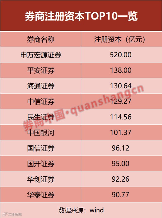 Wind数据显示,申万宏源证券以520亿注册资本在券商中排名第一,远超过排名第二的平安证券。注册资本超过100亿的券商共有6家,依次是申万宏源证券、平安证券、海通证券、中信证券、民生证券和中国银河。