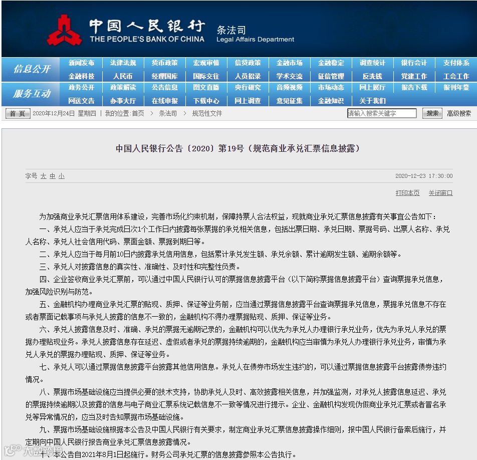 12月23日,央行发布关于规范商业承兑汇票信息披露的公告(以下简称“公告”),提出十条信息披露规范要求,其中明确:该公告将自2021年8月1日起施行。
