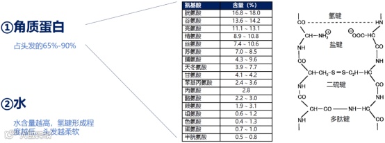 这些氨基酸之间存在4种相互作用——氢键、离子键、双硫键和多肽键。除角质蛋白之外,头发中比较重要的成分就是水。水可以在内部打破氨基酸之间的氢键,而且含量越高,头发摸起来就越柔软。