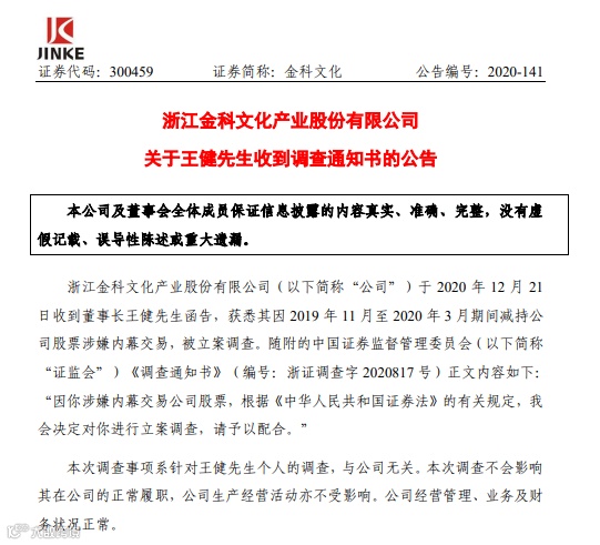 12月21日晚,金科文化发布公告称,公司于当日收到董事长王健函告,获悉其因2019年11月至2020年3月期间减持公司股票涉嫌内幕交易,被立案调查。