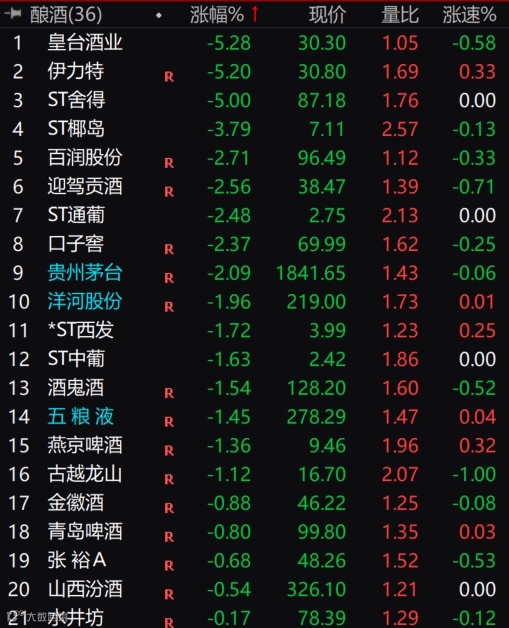 Wind数据显示,截至14:00,白酒指数下跌2.84%,早盘一度涨逾5%,板块内伊力特跌逾7%,酒鬼酒、口子窖、洋河股份等跌逾5%,ST舍得跌停。截至收盘,贵州茅台跌幅超过2%,五粮液杀跌1.45%。其实,相对而言,贵州茅台和五粮液近期的表现要落后于整体白酒股板块,老白干和金种子酒才叫疯狂。