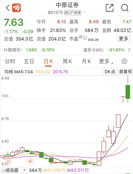 近段时间以来,包括中原证券在内的多只券商股大幅上涨,中原证券自去年12月25日以来7个交易日中实现3个涨停,区间涨幅接近50%,1月5日收盘价7.63元。