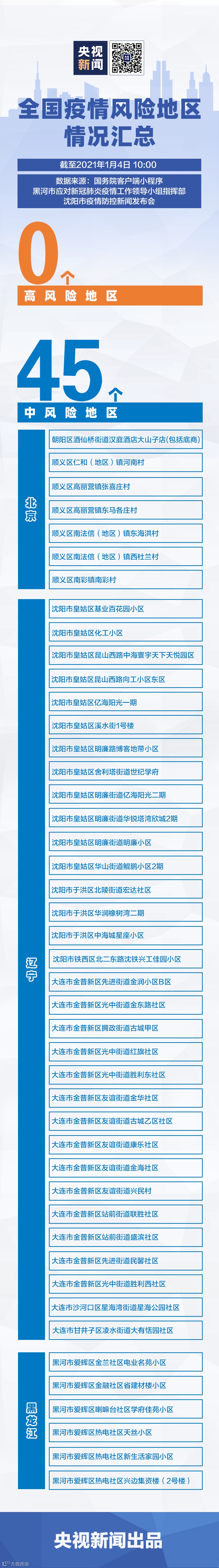 截至2021年1月4日10时,全国共有45个地区调整为中风险地区。
