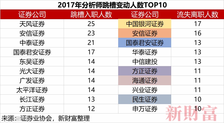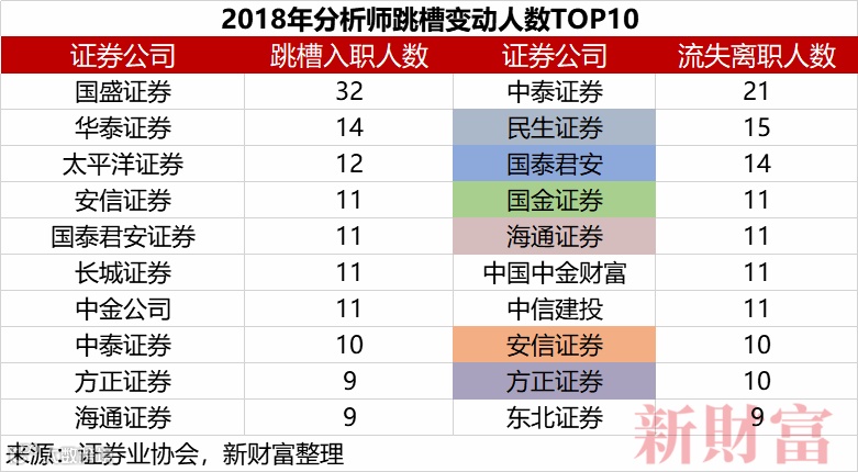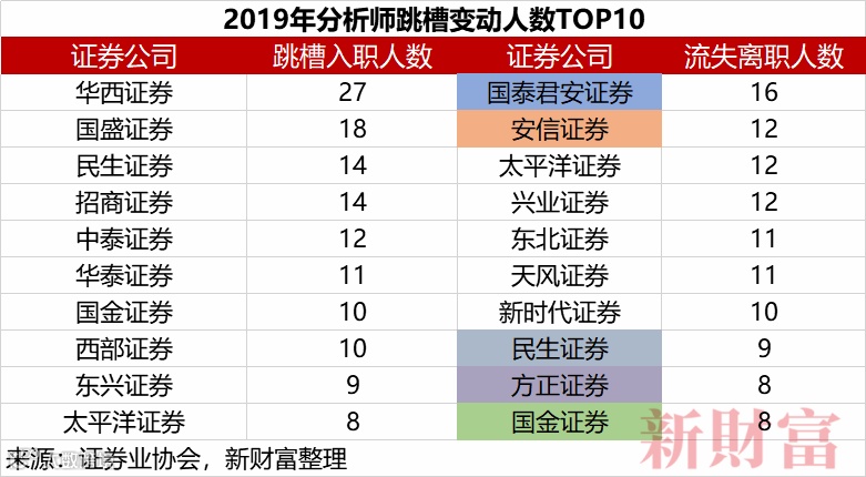 从离职数据看,跳槽离开人数排在前列的包括国泰君安证券、海通证券、天风证券、东吴证券旗下研究所,离职人数均为6人,广发证券和招商证券各为5人,申万宏源证券和兴业证券各为4人,方正证券为3人。