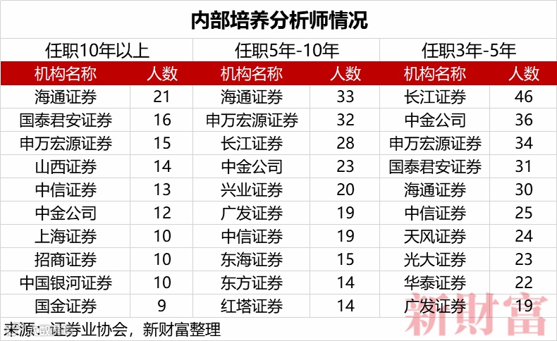 新财富统计的所有内部培养的分析师中,任期超过10年以上的共256位,主要为海通证券17位、国泰君安16位、上海申银万国证券研究所13位。招商证券、中金公司、中国银河证券、中信证券人数也均位于前列。