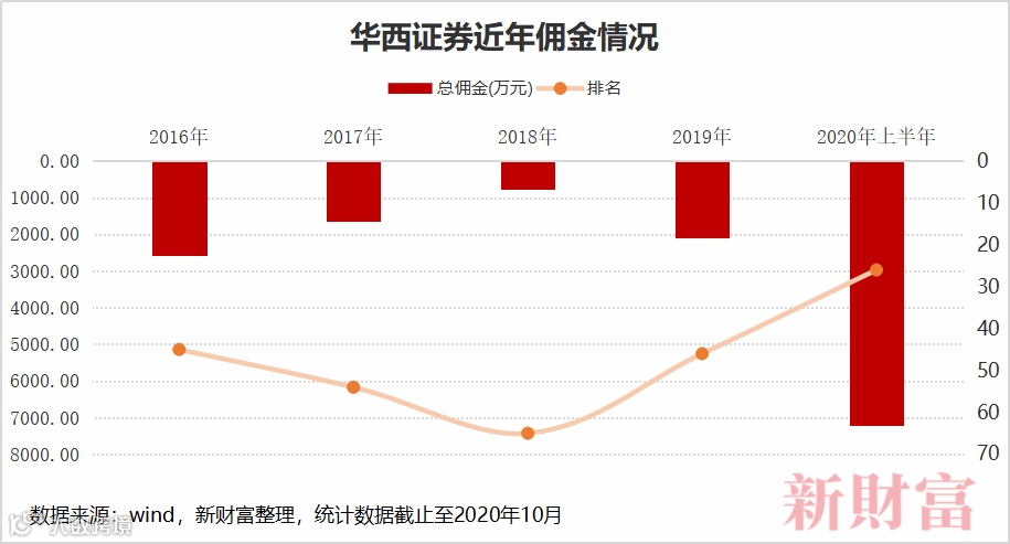 2019-2020年,华西证券在引入大量分析师后,分仓佣金在2019年大幅增长173.08%,排名从2018年的第65位跃升至第46位;2020年上半年,其分仓佣金更是大涨近14倍,涨幅超过了98%的同行,排名跃升至第26位。