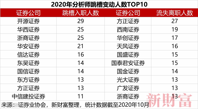 如果从跳槽人员占总人数的比例看,2020年1-10月,跳槽入职人数占比超过40%的券商研究所达8家,包括华西证券、浙商证券、开源证券、信达证券、华安证券,这几家券商均为近一年才开始大力度发展卖方研究业务。