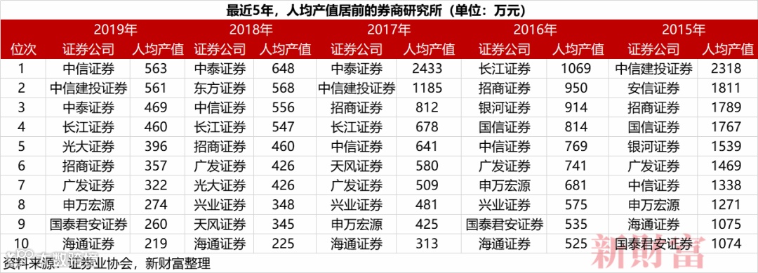 有趣的是,如果以“人均产值”即佣金和分析师人数相除的方式来计算,又有另外的结果。以2019年为例,排名前三的分别是中信证券、中信建投证券和中泰证券。除了中信证券之外,“人均产值”居前的研究所名单里,并没有出现分析师人数排名前五的券商。2018年的情况也类似,排名前三的依次为中泰证券、东方证券和中信证券。如何实现研究业务的高质量发展,也是值得研究所探索的一大命题。