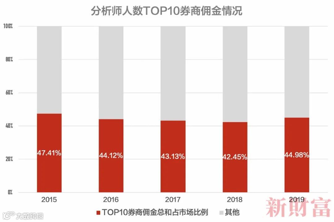 牛市、熊市,券商收入往往存在分野。2015年大牛市,全市场佣金总和高达近60亿元,而2018年只有42亿元。但无论在怎样的行情下,“十大所”的成绩无疑最稳定,拿下的市场份额也最高,2015-2019年其份额合计超过四成;而剩下90%的券商,要争夺其余五至六成的市场。强者恒强的定律,已经成为行业通识。