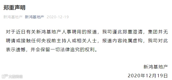 12月19日,新鸿基地产官方微信公众号对外发布消息称,对于近日有关新鸿基地产人事聘用的报道,公司谨此郑重澄清,集团并无聘请或接触任何央视前主持人或相关人士,报道内容纯属虚构,公司对此表示遗憾,并会保留一切法律追究的权利。