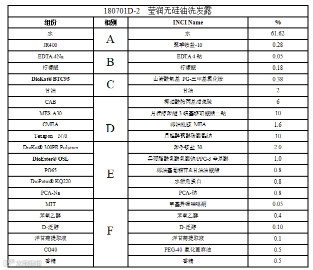 Diocat® BTC95是一款季铵盐化合物,作为强效的头发调理剂有效改善头发的干/湿梳理性。BTC95为高纯粉状产品,溶解性良好、易于使用,与阴离子表面活性剂良好的配伍性,可在透明洗发水中使用。