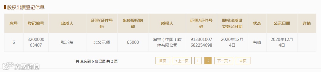 此外,国家企业信用信息公示系统信息还显示:张近东还将6.5万股苏宁置业集团股权出质,质权人同样为淘宝(中国)软件有限公司,股权出质登记日期也为今年12月4日。