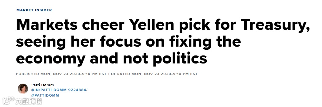 在耶伦被提名为财长的消息传开之后,华尔街瞬间嗨翻了。来自CNBC的标题,用了一个词叫cheer(欢呼)。