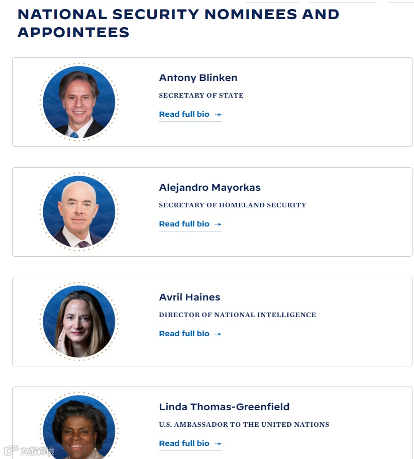 其他的提名为:琳达·托马斯-格林菲尔德(Linda Thomas-Greenfield)将出任美国常驻联合国代表;杰克·沙利文(Jake Sullivan)将出任白宫国家安全顾问;亚历杭德罗·马约卡斯(Alejandro Mayorkas)将出任美国国土安全部部长;艾薇儿·海恩斯则将出任美国国家情报总监。