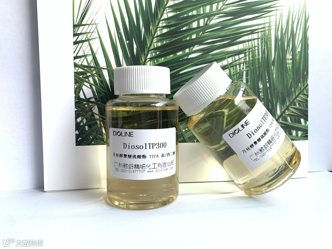 Diosol TP300是一款用于油性沐浴泡泡及沐浴油的无水、高浓度的阴离子表面活性剂,应用在透明产品里时,Diosol TP300 能和极性植物油脂,例如蓖麻油,以任意比例相容;使用极性较小的油脂,如橄榄油,太阳花籽油,甚至石蜡油,要使体系透明,须添加协同乳化剂。当类似产品在水里形成粗分散体系时,虽然体系含有高含量油份,但会变成乳状水包油混浊液,同时具有丰富的泡沫。