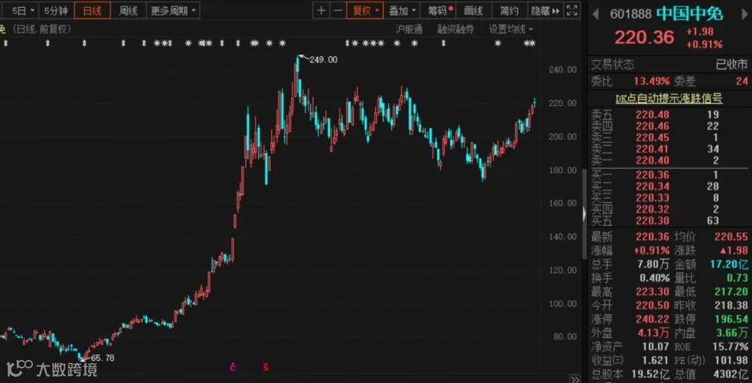今年7月1日,海南离岛免税新政正式实施,在品类、件数、行邮税门槛三方面同时放宽。二级市场上,免税板块应声大涨,中国中免股价一度飙升至8月3日249元/股的高点,公司目前已回落至220.36元/股,但年涨幅仍高达约149%,总市值达4302亿元。