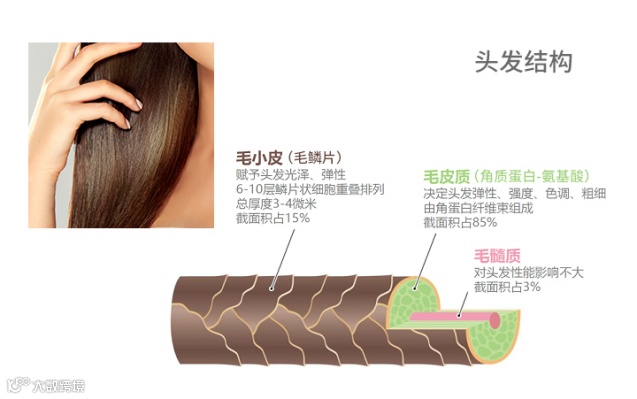 头发分为两部分:毛干和毛根,毛干的环境是头皮内部,毛根的环境是头皮外部)。毛干由内向外侧依次为:毛髓质、毛皮质、毛小皮。