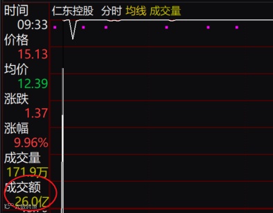 按照均价即跌停价12.38元/股推算,该笔撬板资金规模或超过20亿元。从仁东的分时图可以看到,9点33分,仁东控股一分钟的成交额高达26亿。