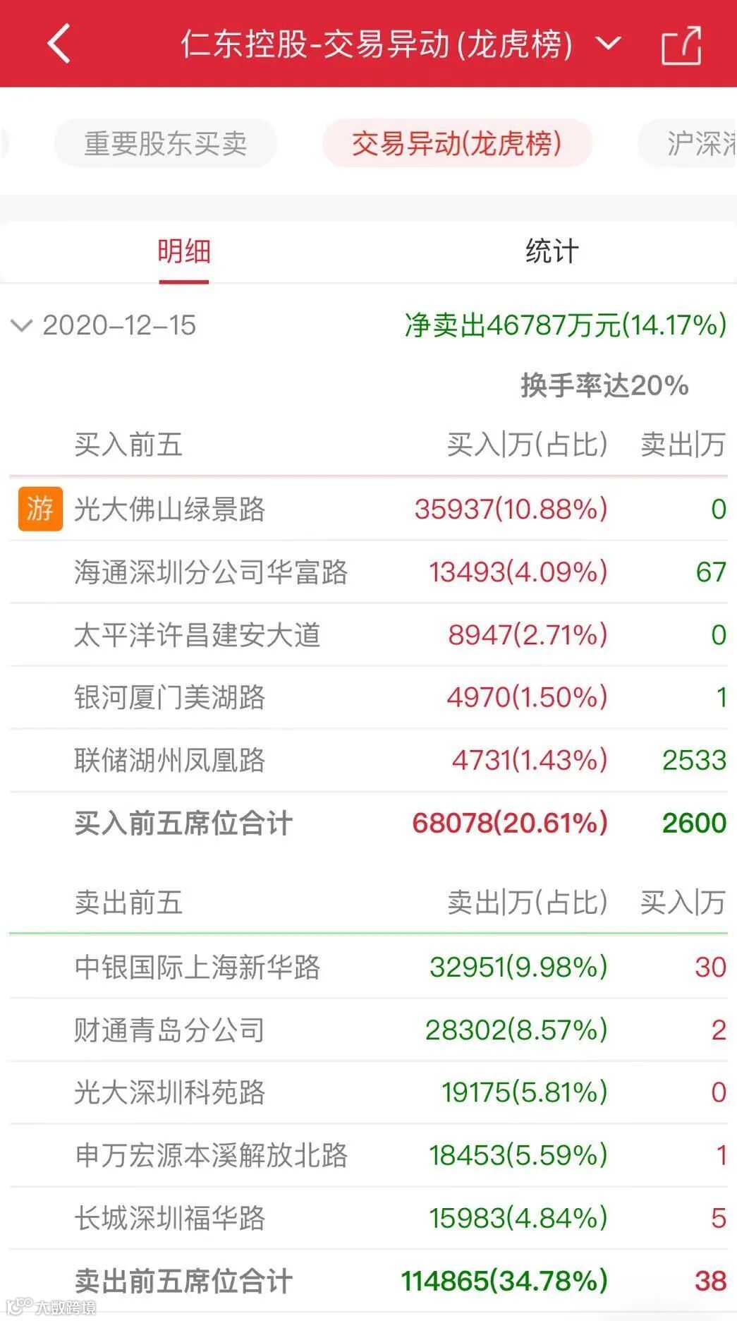 12月15日下午,仁东控股龙虎榜数据显示,前五营业部合计买入6.81亿元,其中,光大证券佛山绿景路买入3.59亿元。值得注意的是,该营业部近三个月没有上过龙虎榜,近一年上榜47次,并非市场所熟悉的游资营业部。
