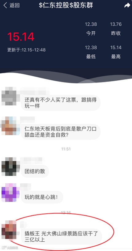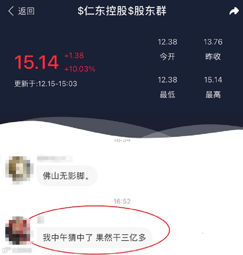 不过,在"尺度"App仁东控股的股东群中,有网友表示“撬板王,光大佛山绿景路应该干了三亿以上”,值得注意的是,其发布时间为中午12点,龙虎榜数据在盘后才更新。果然,最终光大证券佛山绿景路买入3.59亿元,不过该网友消息声称的“撬板王”尚未得到证实。