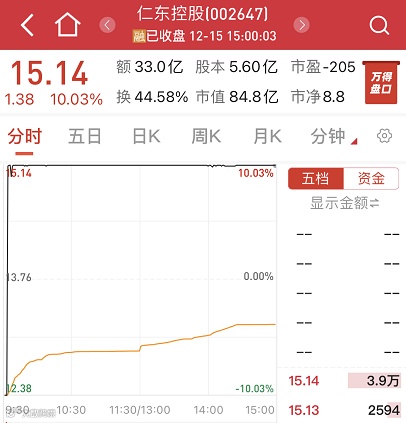12月15日早盘,开盘后第三分钟,仁东控股突然涌入巨量买单,超过170万手资金将压在仁东控股上多达160万手的卖单全部吃下,并且瞬间将仁东控股从跌停拉至涨停。按照均价推算,该笔资金规模或超过20亿元。