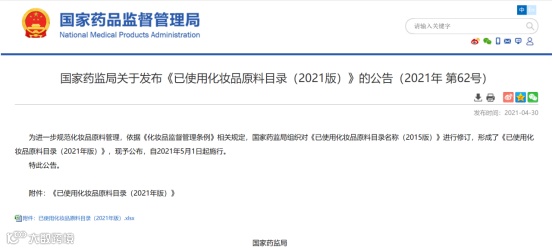 4月28日,国家药监局官网发布了《已使用化妆品原料目录(2021年版)》,目录中收录的原料被列为化妆品禁用组分、限用组分或者准用组分管理,于5月1日起实施。